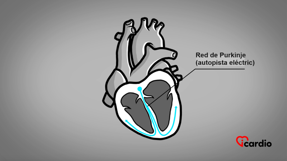 Tan pronto como la electricidad ha pasado el «aduanero» eléctrico, la corriente se transmite a los ventrículos derecho e izquierdo a través de 2 ramas, es decir, 2 cables eléctricos distintos, con una conducción rápida.